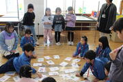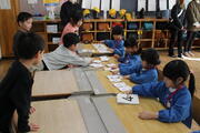 1年生のみんなは、案内、国語、算数、けん玉、こま、かるた等、それぞれの役割に分かれて、年長児さんをもてなしました。