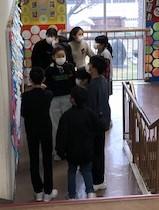 たくさんの6年生が階段の踊り場で掲示物をうれしそうに見たり、メッセージを読んだりしながら、ワイワイ話をしています。掲示板には1年生がつくった似顔絵入りのメッセージカードが飾られています。照れくさそうに自分のカードをめくる子、興味深げに友達のカードを眺めている子など、楽しみ方は様々ですが、6年生の顔はみんな穏やかでにこやかです。リーダーの卒業に向け、学校はやさしい時間につつまれています。